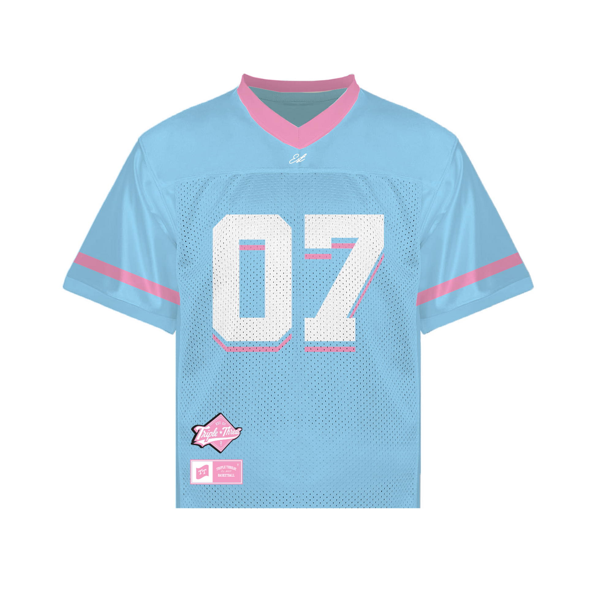 Step into game day with unmatched style and bold energy in the '07 Blue Football Jersey. This limited-edition piece fuses athletic performance with high-end streetwear aesthetics, combining a distinctive eye-catching design with pink Triple Threat badges and a subtle light blue mesh body for breathability and comfort. Ideal for casual wear, sporting events, or as a statement piece in your wardrobe.