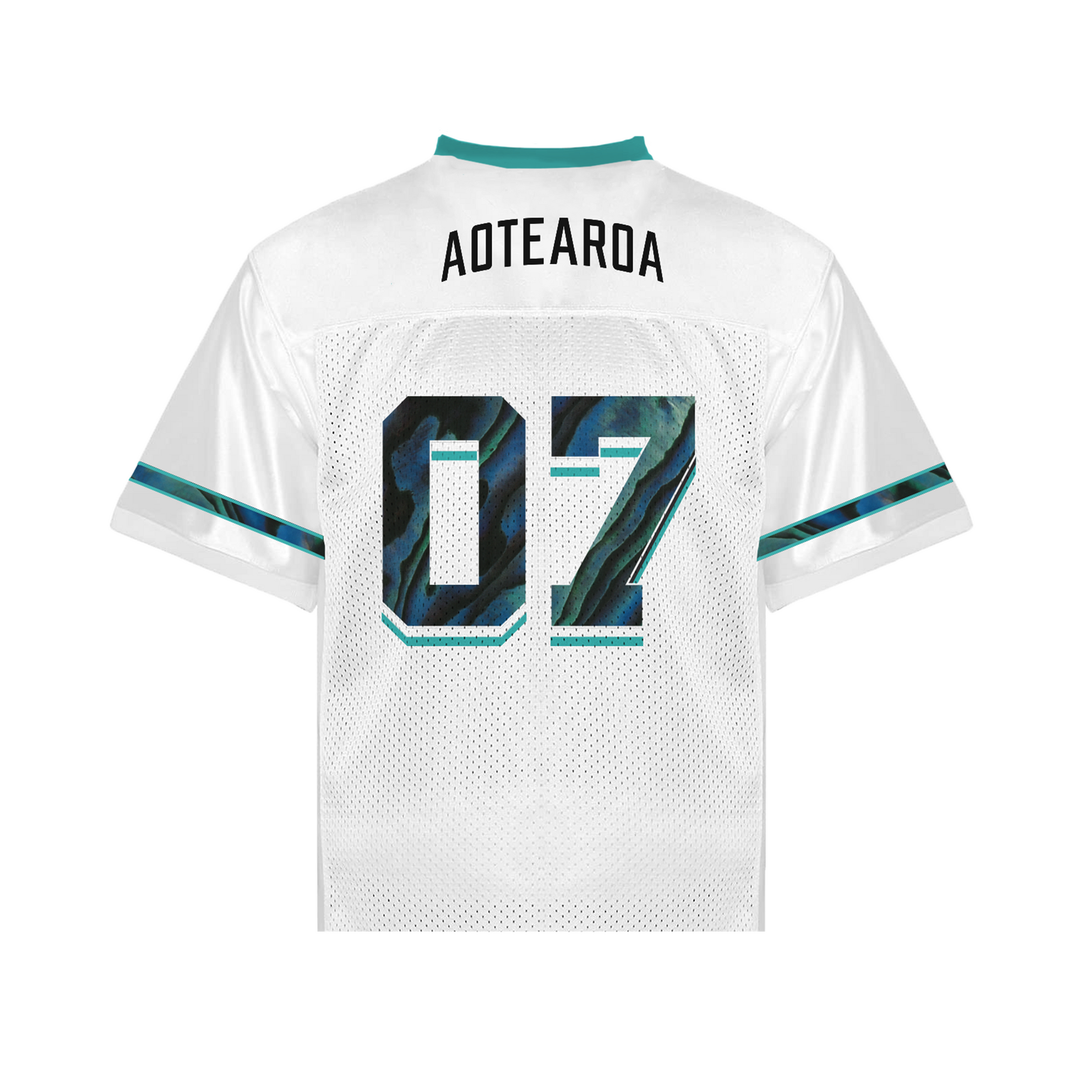 The oversized "07" graphic takes centre stage with a paua shell-inspired pattern, blending oceanic hues of blue, green and black to deliver a statement look. Accented by teal trim on the V-neck collar and sleeves, this jersey turns heads both on and off the field.